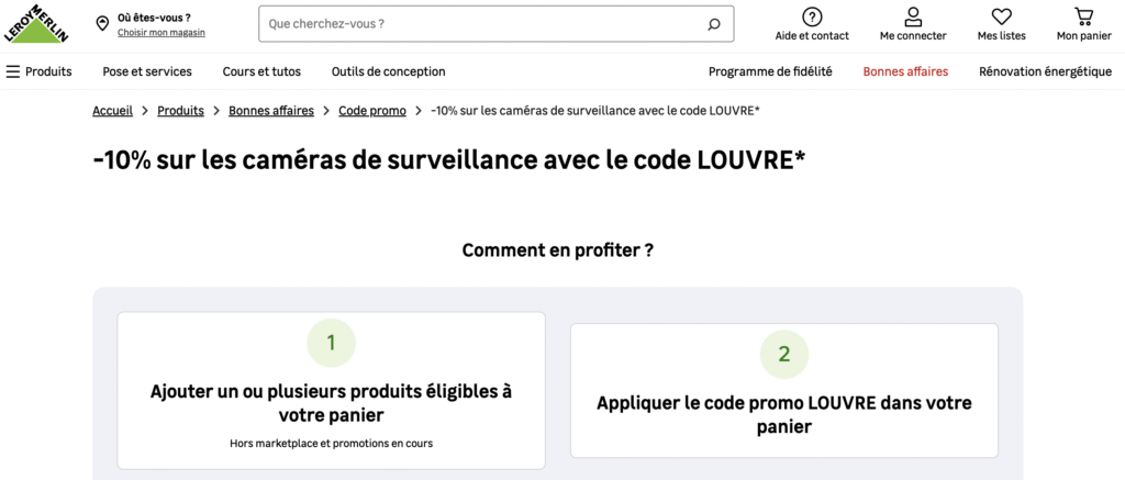 Capture écran de la page https://www.leroymerlin.fr/produits/bonnes-affaires/code-promo/10-sur-les-cameras-de-surveillance-avec-code-louvre/